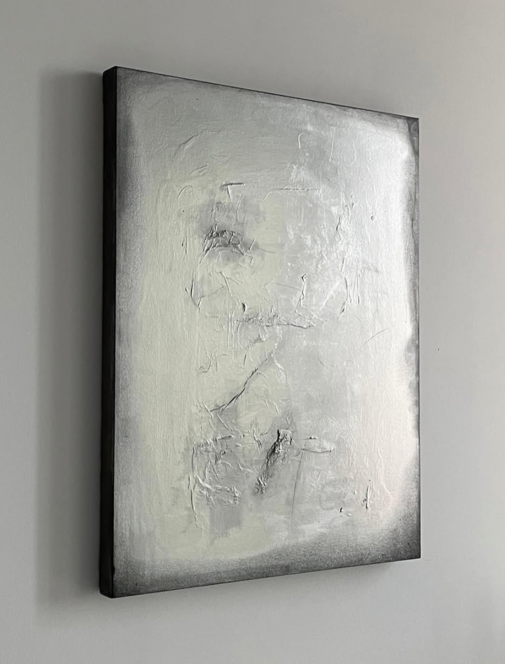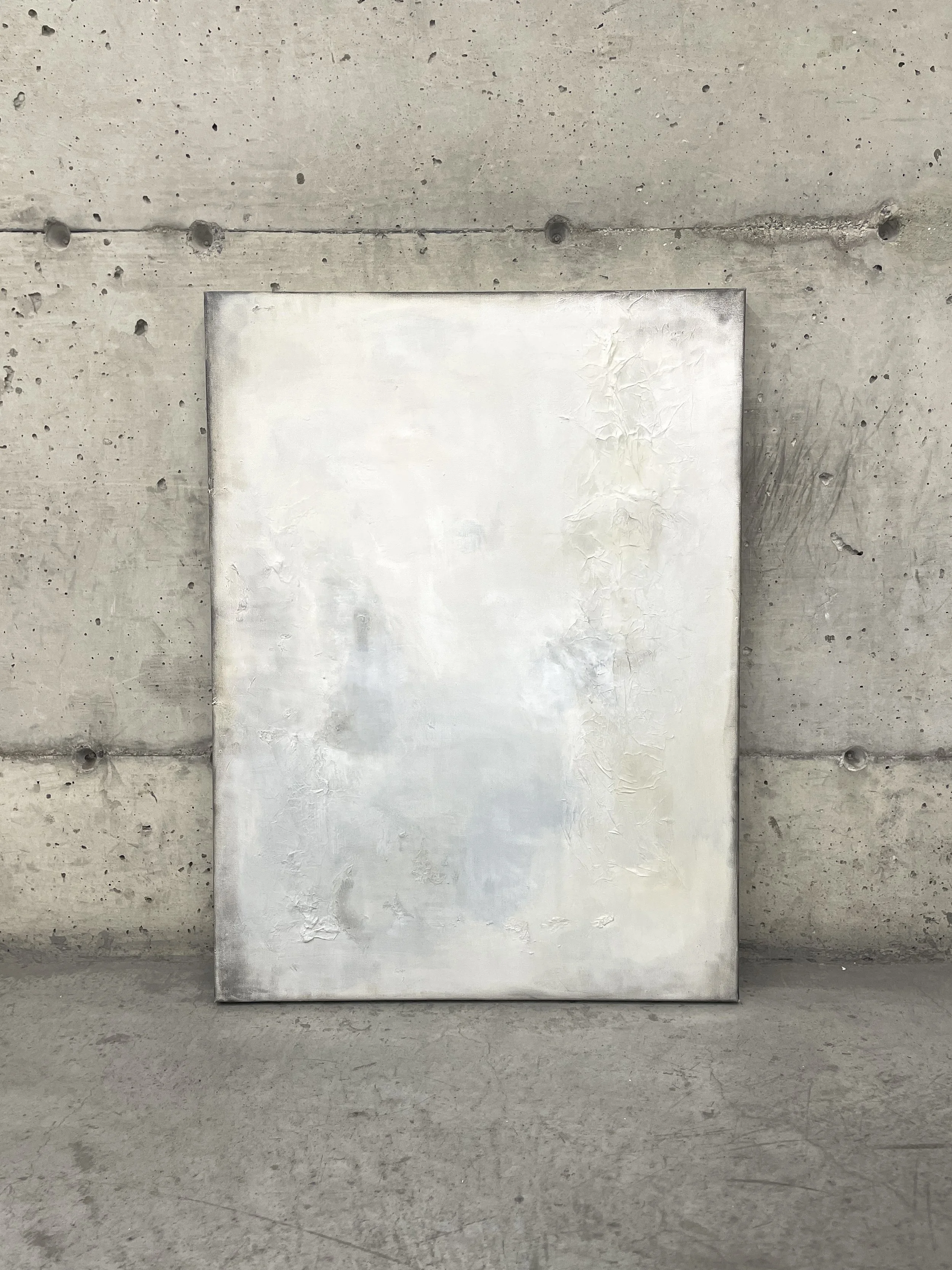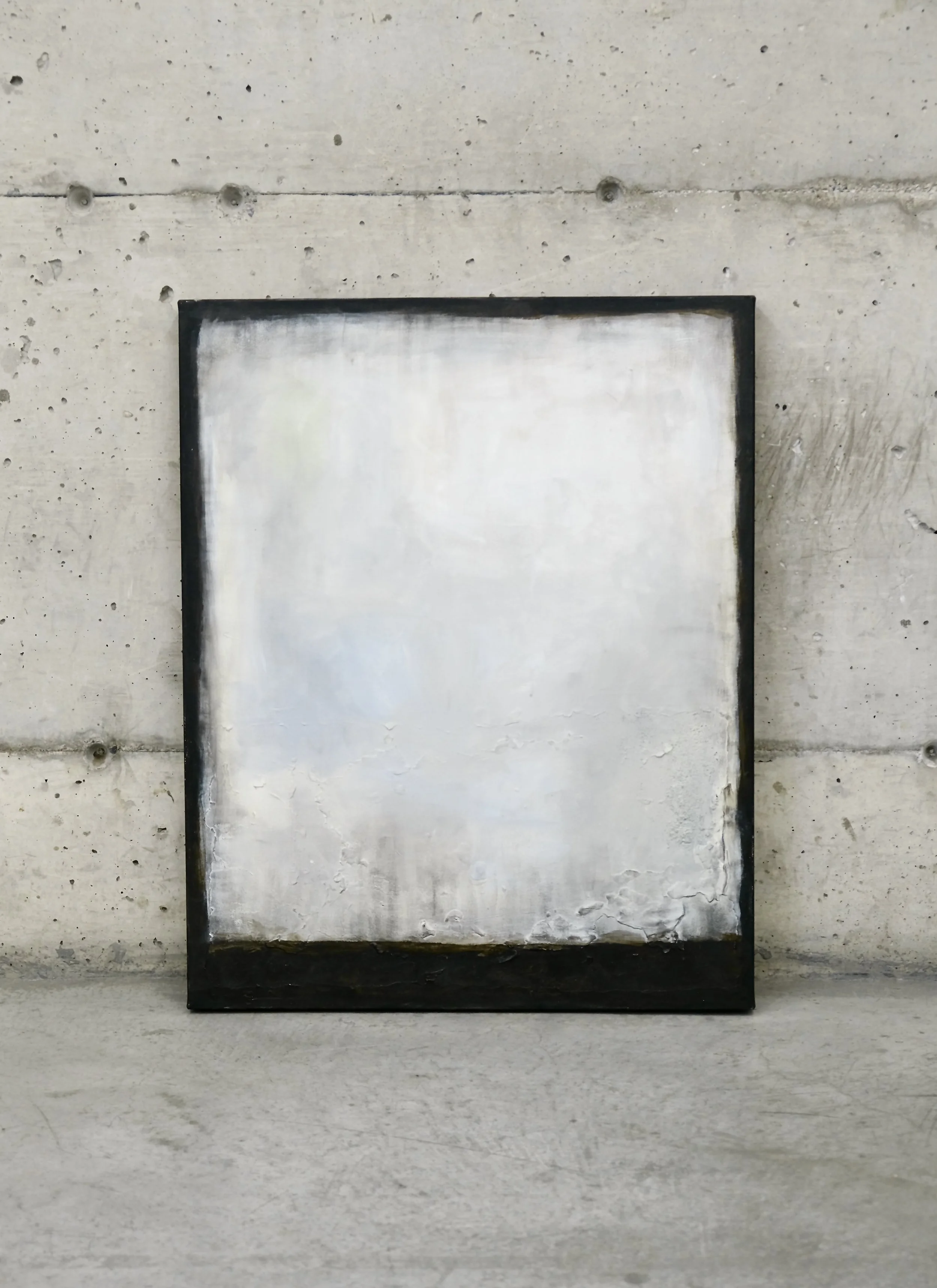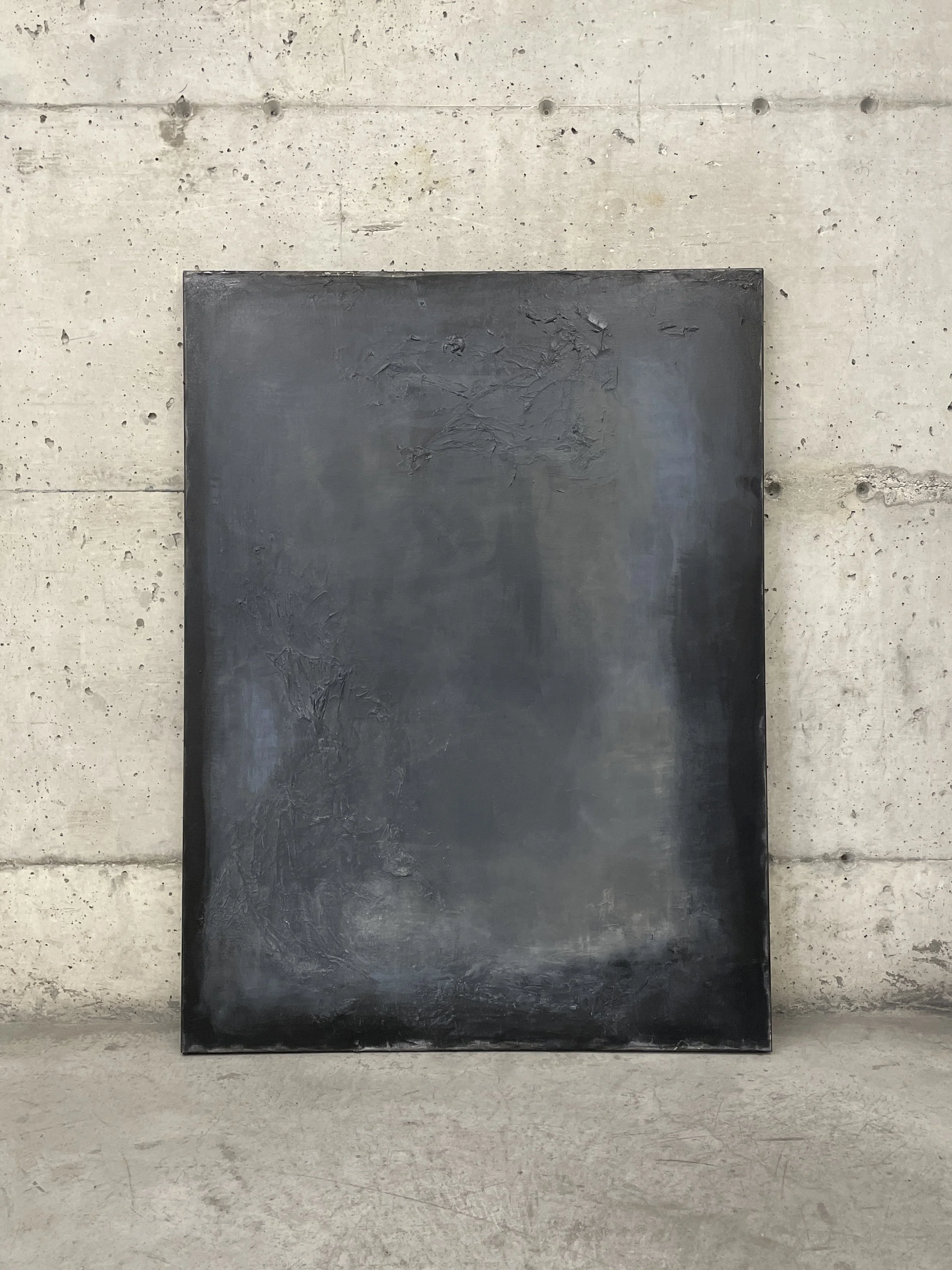 Ces surfaces stratifiées interrogent la notion de complétude, ce qui semble inachevé devient porteur de sens, et l’imperfection apparaît comme un signe de présence. La matière, loin d’être un simple support, agit comme un corps sensible qui conserve les traces de sa transformation. La peinture se présente ainsi comme un processus ouvert, un espace de métamorphose où dans ce cas-ci la teinte n’est pas fixe, mais évolue subtilement avec le temps.